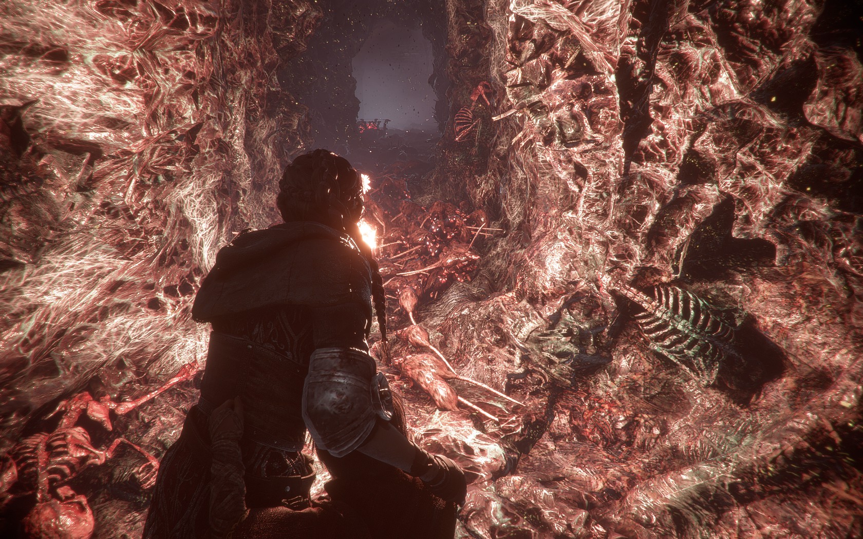 In case it’s not clear I would say that for the most part of A Plague Tale I was pretty gripped and engrossed. Partly due to some extremely solid atmospheric work and partly due to some excellent environmental design and set pieces. In fact a lot of the environments, while absolutely stupidly over-the-top, were genuinely incredibly good. For instance, I have seen a battlefield scene in particular be lauded for how incredible it looks whereas for me I found it a little unrealistic how there were literally mountains of dead bodies stretching all the way to the horizon. That said, it actually carries across to how good-looking the game is in general. I think broadly it’s just extremely well-designed and “pretty” (in a gruesome, horrific kind of way). Plus there might be an argument to be made that as this is through the eyes of children everything seems much worse than it might really be. It also does succeed in being pretty atmospheric with Amicia dragging Hugo through dark caves and ruins and towns which have been overrun and decimated by the plague.