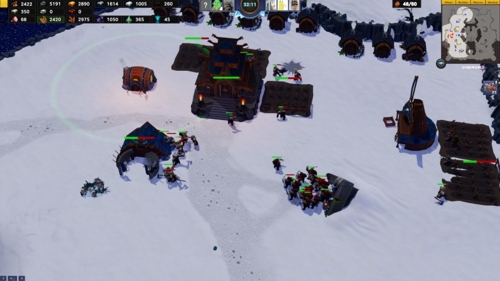 Seb: For my part, and maybe I’m biased, I would say that it felt like the Warrior was both the most janky and least complete of the three classes. Like, movement and attacking were just borked, so it was frustrating to play. But then also it didn’t feel like I could do much proactive. For the most part, unless I was building units I was just flicking back and forward between above ground and underground trying to spot an attack coming and then desperately rushing to defend if I did see one (and usually failing to get there in time). But I guess I don’t know how much of that is because of inexperience on our part or just poor balance in the game. Also, just as an aside, I have to mention again that I HATE the fact that the fog-of-war is not just “fog-of-war” like in other RTSes, but just completely black so you can’t direct units properly to an area outside of your line-of-sight.