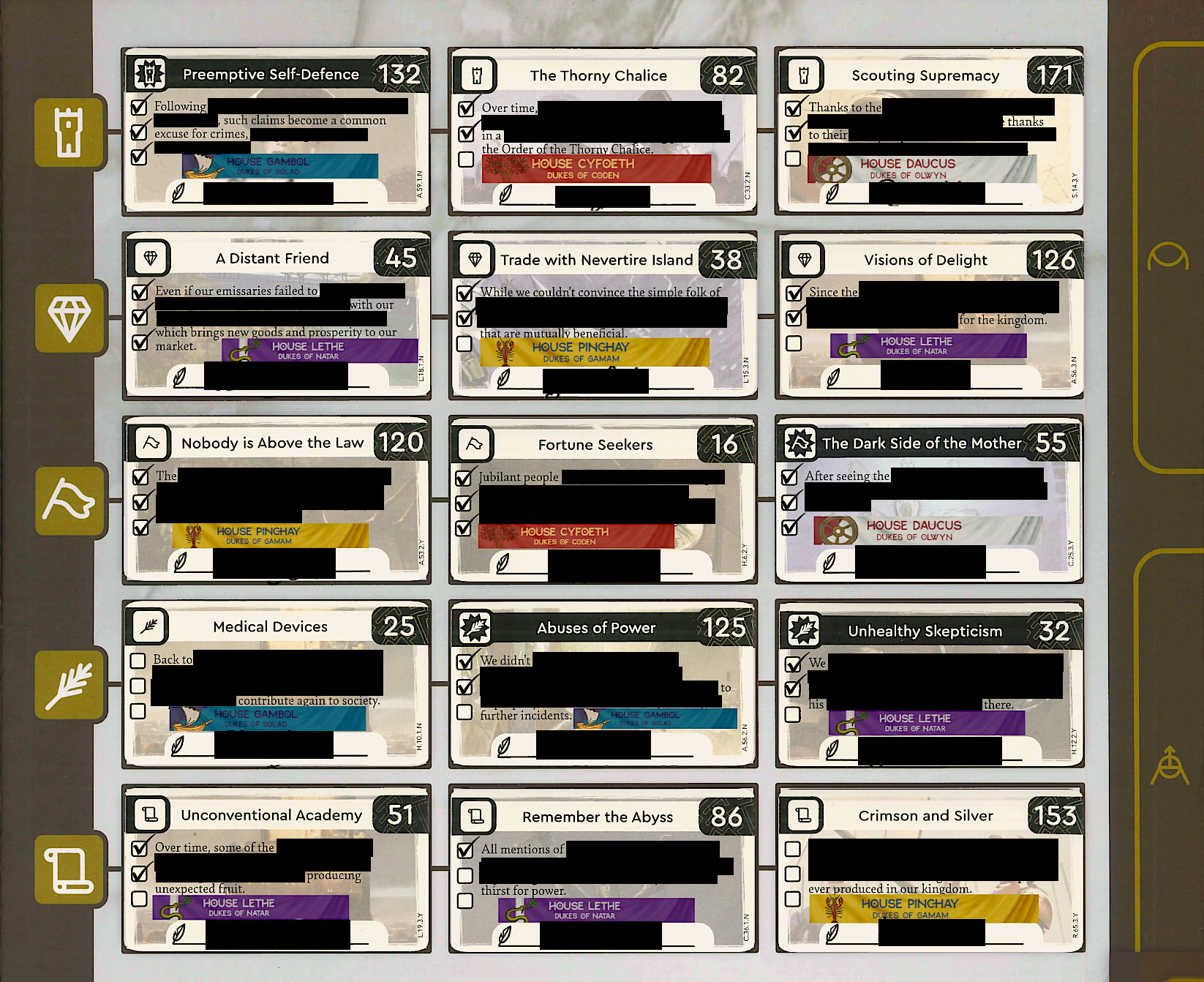 Alternatively, the game may ask you to place one of 177 stickers at the top of your board and sign it, representing the lasting consequences made by your house in a particular dilemma. Sure we have more soldiers in the army, but now the populace is constantly aware that your house cares more for swords and shields than it does for their well-being and so in each subsequent game you personally will have the added objective of trying to deal with this negative opinion of the people with an “open agenda” where if once more a game ends with morale in the dumps you lose points as the people further scorn your attitude. Or alternatively if it ends up high, then you gain extra points due to the people’s awareness that you went against your own tarnished reputation.