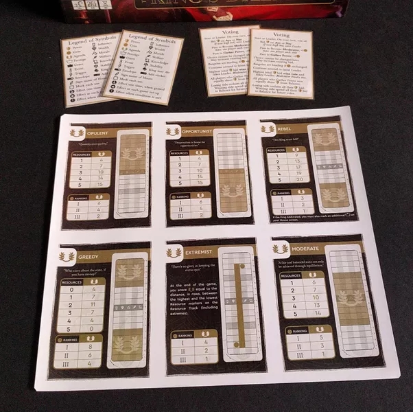 If at any point during the game the cumulative stability of these five markers (representing influence, welfare, knowledge, morale and wealth) gets too high or too low, this results in the game’s end as the King either overturns his council or he abdicates in shame respectively. Alternatively, if a balancing act is played for long enough then the King may simply die of old age, again causing the end of the game.