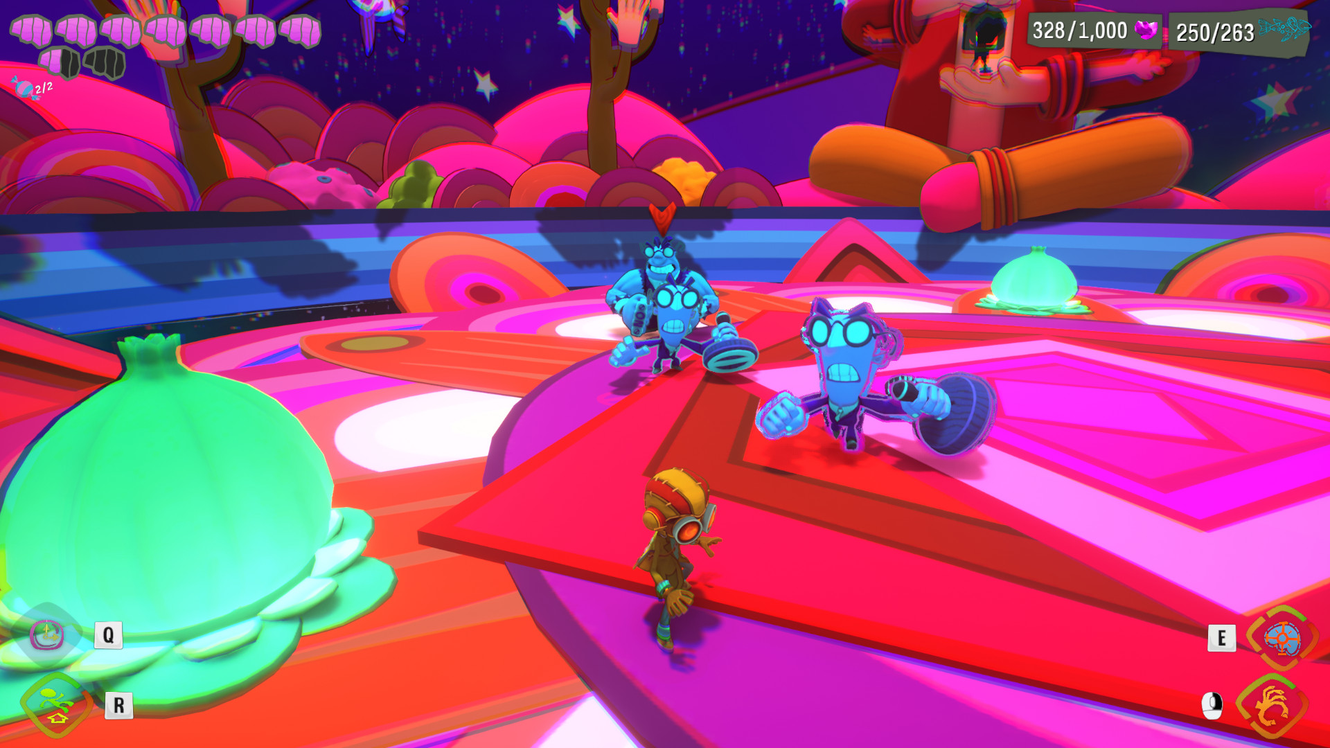 On the subject of powers, it is these same traversal abilities which Raz uses in combat, which is kinda neat. The ability which allows you to grappling hook towards specific points can be used to drag enemies towards you, the fire bomb can be used to burn away paintings and reveal hidden passages, the time bubble ability can be used to both slow down enemies and also moving platforms and then the PSI blast ranged attack can be used… As a ranged attack… Okay some are less about traversal, but for the most part every ability has a use both inside and outside of combat and that’s just good game design.