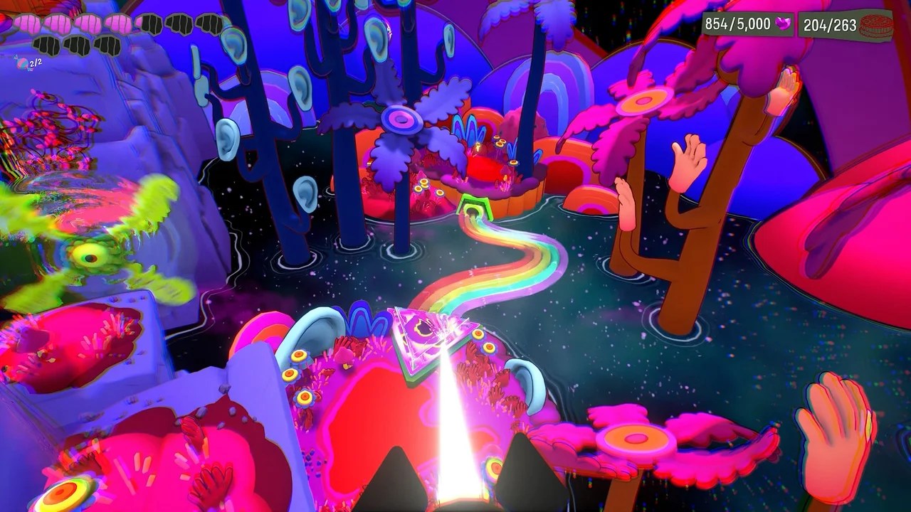 Of course, with such a broad range of types of things to experience, there is also a fairly large range of quality. Some of the missions, such as those of the fractured mind of one recurring character and the game show I mentioned are genuine highlights, while other missions like the aforementioned library really just dragged on-and-on. The visuals of each mission are all extremely striking and vibrant, but there is also the unfortunate downside that given the extremely stylised nature of the game these environments can also grate on the eyes because of jarring colour-schemes and overly saturated worlds.