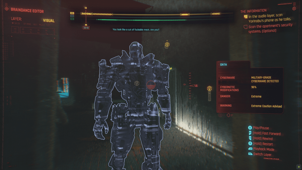 It felt like there was so many possibilities for little side activities and fun things to do and find, and the game just really didn’t provide you with any of them. I think, actually, most likely because they ran out of time. The biggest example of this is the brain dances (BDs). You are given the tools to view other people’s brain “recordings”, see what they saw and feel what they felt as they were recording. This comes up in several story beats. And there are places all over the city where you can actually buy BDs. Which don’t do anything. It really felt like there was a whole thing here planned which they simply never got around to.