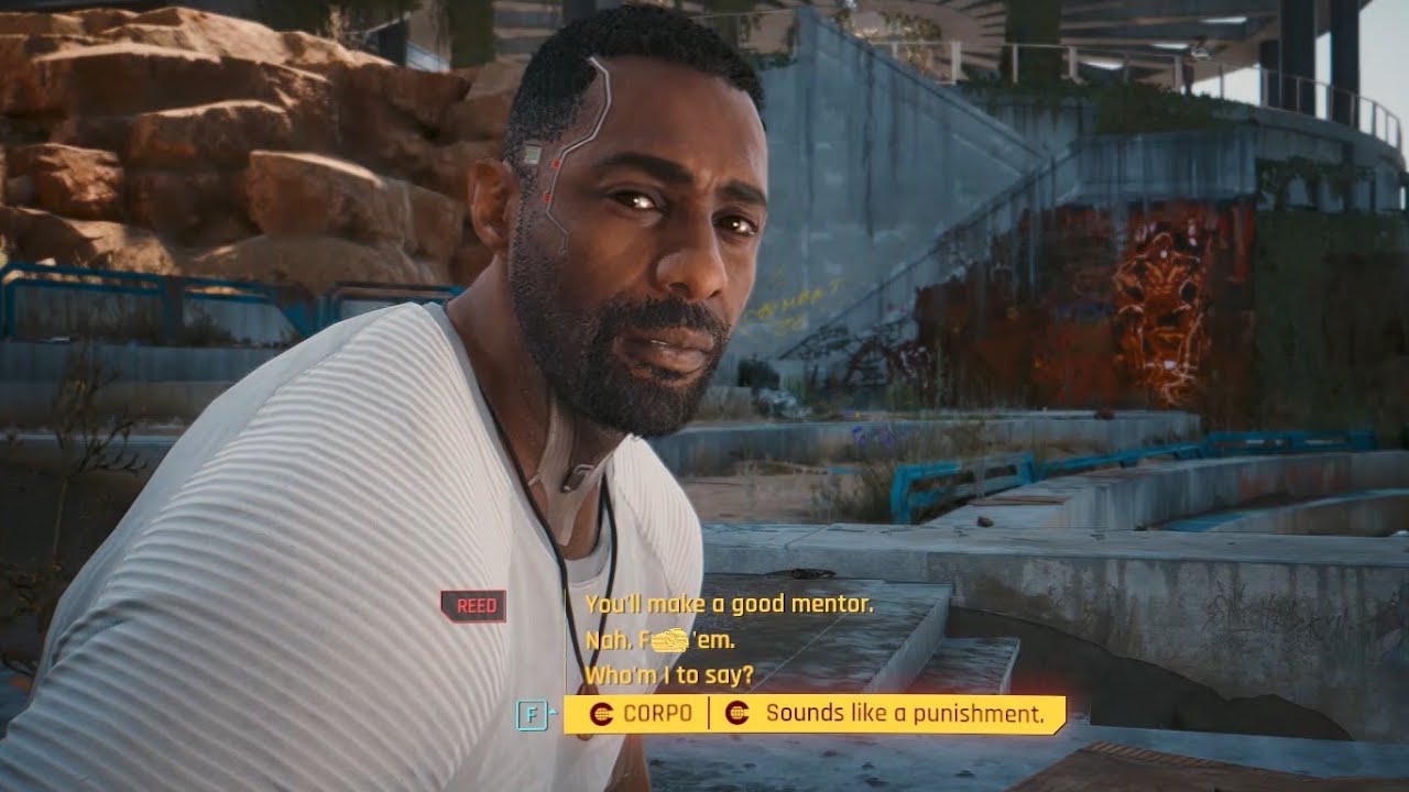 The last thing I want to touch on then is specifically Phantom Liberty. Phantom Liberty honestly features Cyberpunk at its absolute best and its worst. The central story of the DLC is fucking exceptional. It has intrigue, drama, high stakes, and it still slots so perfectly into the existing story of Cyberpunk. It also features Idris Elba absolutely phoning in the most boring voice performance as super-spy Reed. This expansion featured some of my absolute hands-down favourite missions in the whole game (particularly the one where you use some magical sci-fi face-changer).